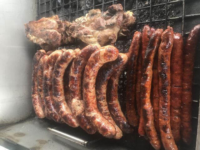 La viande proposée au barbecue sont des saucisses, merguez, jambon blanc fumé, côte échine, tacos ainsi que des frites maison!!!